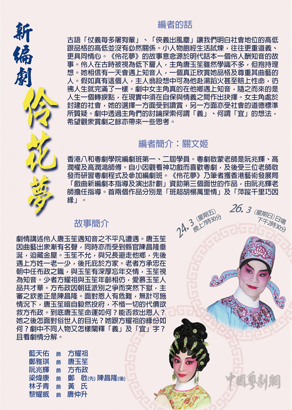 粤剧《伶花梦》、《炼印》、《周瑜》将于3月24-26日在香港元朗上演