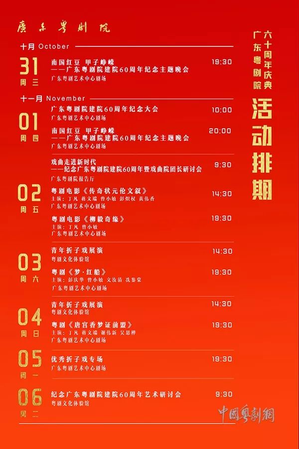 为纪念建院六十周年,广东粤剧院将在10月31日至11月6日期间举办一系列的纪念活动。